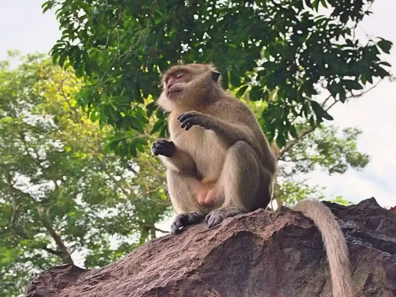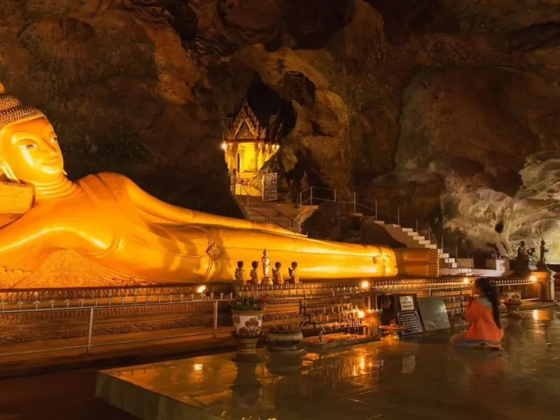Wat Suwan Kukha Cave Temple with a tour of the stalactite cave and the reclining Buddha. Opportunity to feed monkeys at the entrance